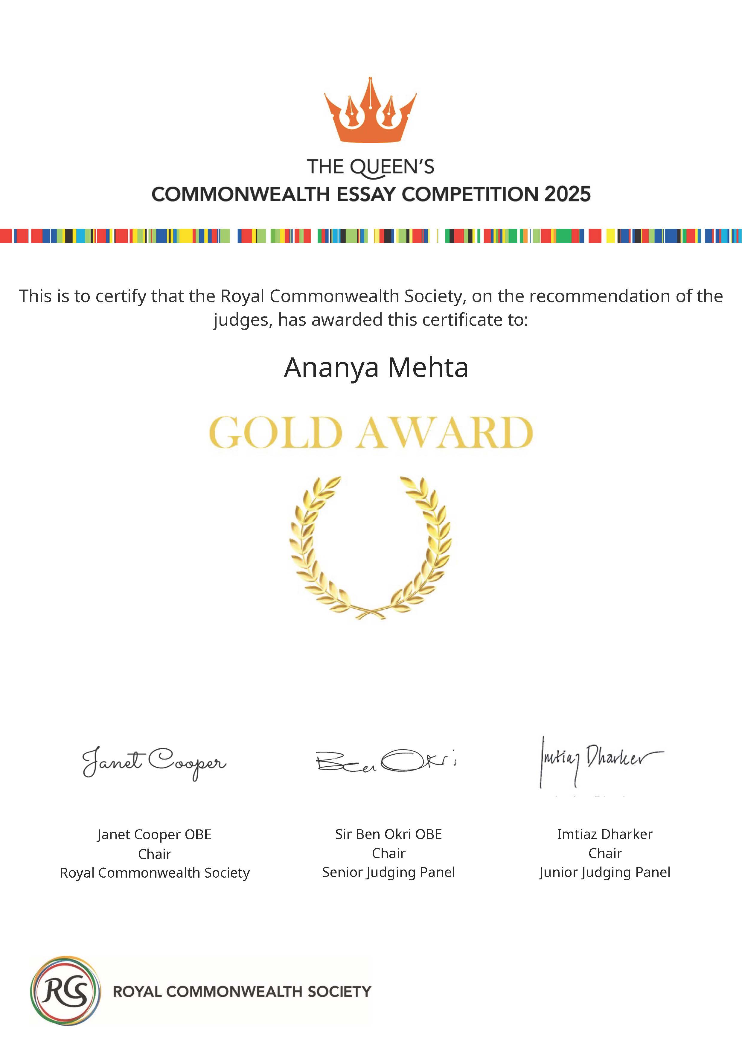 Ananya Mehta of DAIS IGCSE Class 9C has been awarded the prestigious Gold Certificate in the Queen’s Commonwealth Essay Competition 2025 for her impactful piece titled “Sisterhood, Sorrows and Sacrifice.”