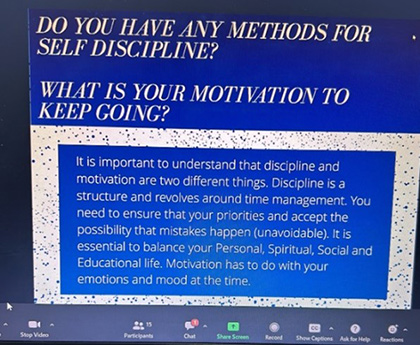 The delegates were grouped into different breakout rooms to dive deeper into the postcard theme. Student leaders from the host school engaged the attending delegates in interesting and fun icebreakers such as - "What TV Show would you choose to live in and why?" This icebreaker helped all delegates warm up to each other and discuss openly some questions - "How do you feel about exams?" "What gives you stress?" and many more. These discussions soon turned into quick debates on different perspectives such as - 'is stress useful or not' and 'the difference between good and bad stress'. The delegates also shared their own coping mechanisms including spending time in nature, listening to music, sleeping, spending time with their family and enjoying with pets. Overall, the baraza sessions were a highly enlightening experience. After the conclusion of the baraza sessions, the delegates were led back into the main meeting waiting for a Q&A session with the keynote speakers.