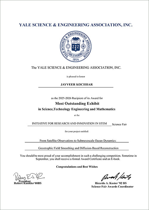 His award-winning project, “From Satellite Observations to Submesoscale Ocean Dynamics: Geostrophic Field Smoothing & Diffusion-Based Reconstruction,” showcases exceptional depth in scientific research and innovation, highlighting his ability to address complex real-world challenges through advanced analytical approaches.