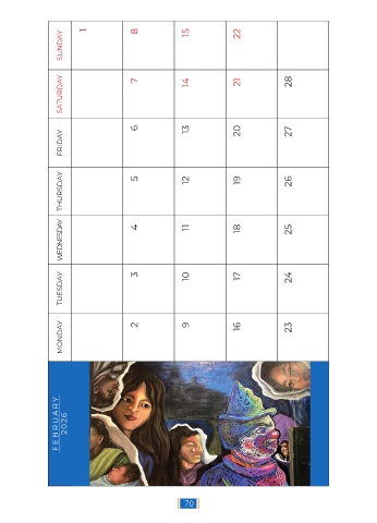 1 8 15 22 SUNDAY SATURDAY 7 14 21 6 13 20 27 28 FRIDAY THURSDAY 5 12 19 26 WEDNESDAY 4 11 18 25 3 10 17 24 TUESDAY MONDAY 2 9 16 23 F E B R U A R Y 2026 70
