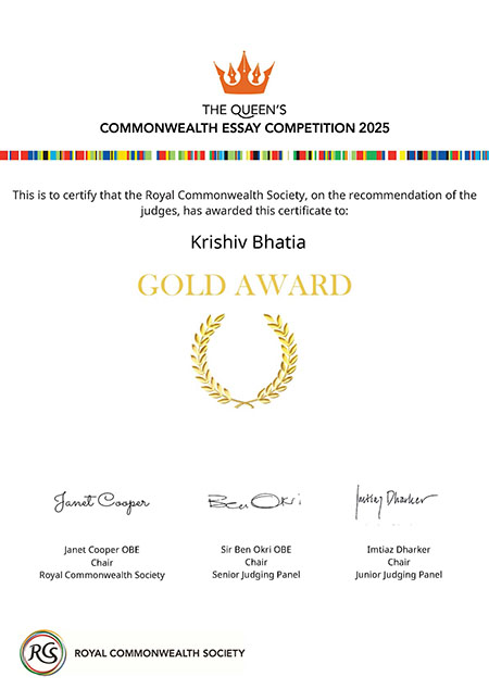 He has won the Gold Award at the Queen’s Commonwealth Essay Competition (QCEC) 2025, the world’s oldest and most prestigious international schools’ writing competition. This year saw a record-breaking 53,434 entries from across the 55 Commonwealth nations, making his achievement truly outstanding. Krishiv’s essay stood out for its depth, creativity, and powerful engagement with global themes, placing him among the top young writers internationally.