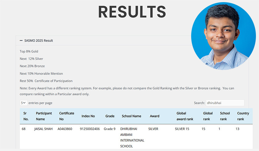 Jaisal Shah of IGCSE Grade 9 B won a Silver Award at the Singapore and Asian Schools Math Olympiad (SASMO) 2025, placing him in the top 20% of over 66,000 participants from 42 countries worldwide.
