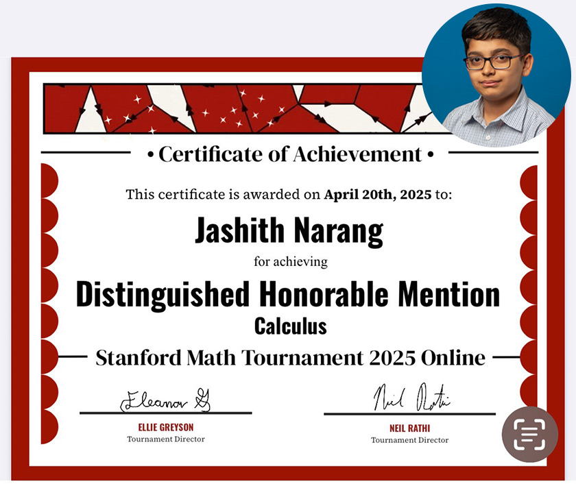Jashith Narang of Grade 9 C has been awarded the Distinguished Honourable Mention Certificate in the Calculus domain of the Stanford Math Tournament (SMT) 2025, placing him among the top 10% globally.