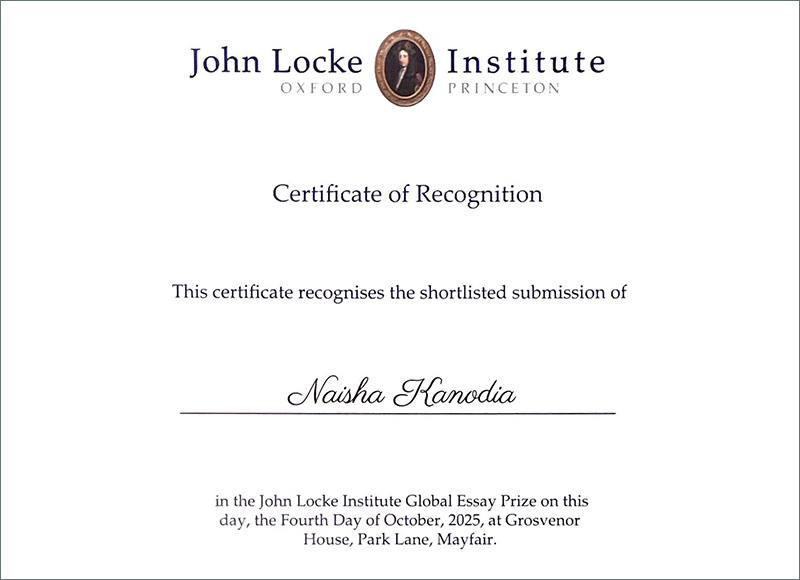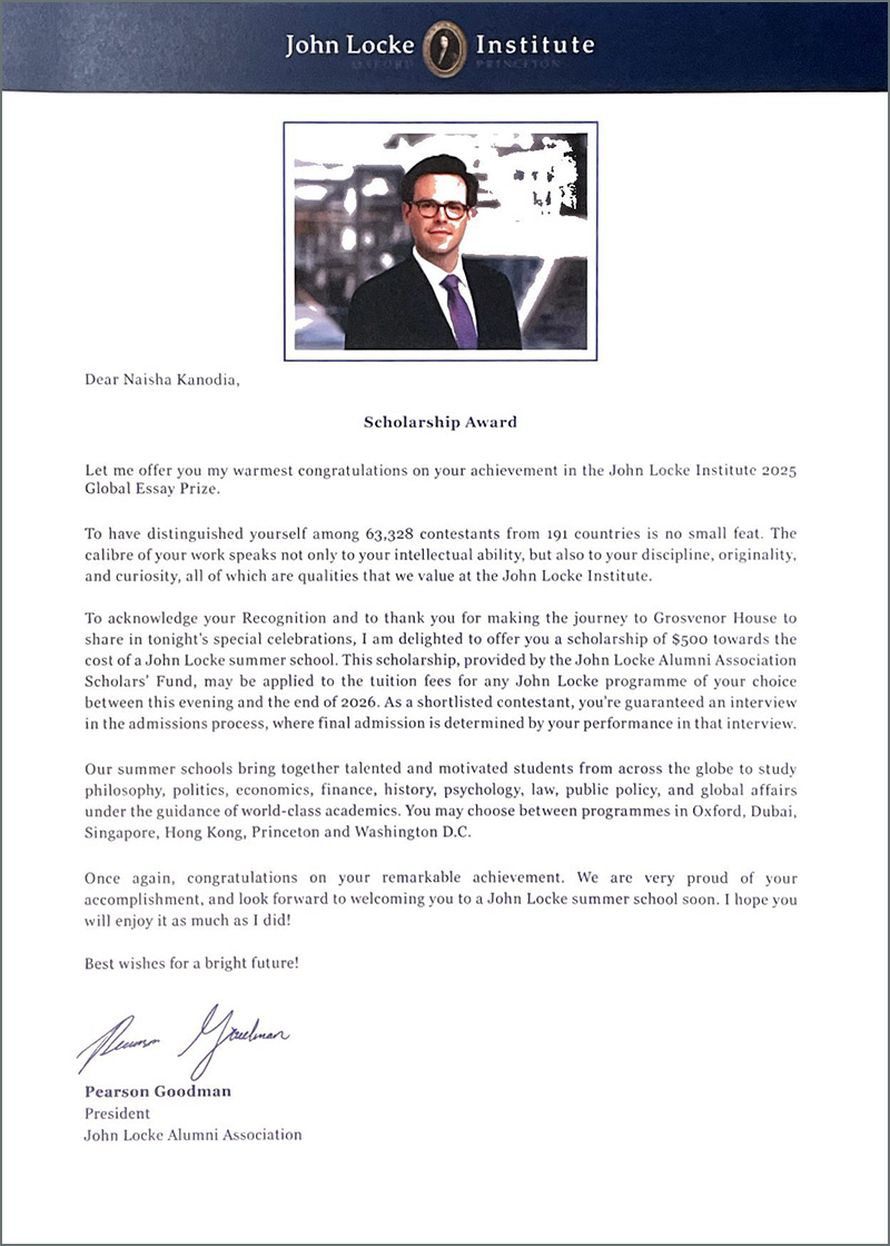 Naisha Kanodia of IGCSE G9 Shortlisted for John Locke Institute 2025 Global Essay Prize